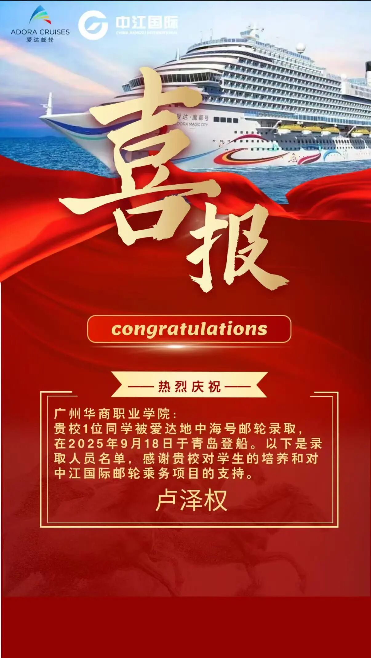 热烈祝贺广州华商职业学院卢泽权同学被爱达地中海号邮轮录取,于2025年9月18日在青岛荣耀登船!这一成果是卢泽权同学个人努力的见证,也体现了广州华商职业学院优质人才培养的成果。爱达地中海号邮轮作为行业领先品牌,其严苛的选拔标准彰显了对我校学子专业素养与综合能力的高度认可。
