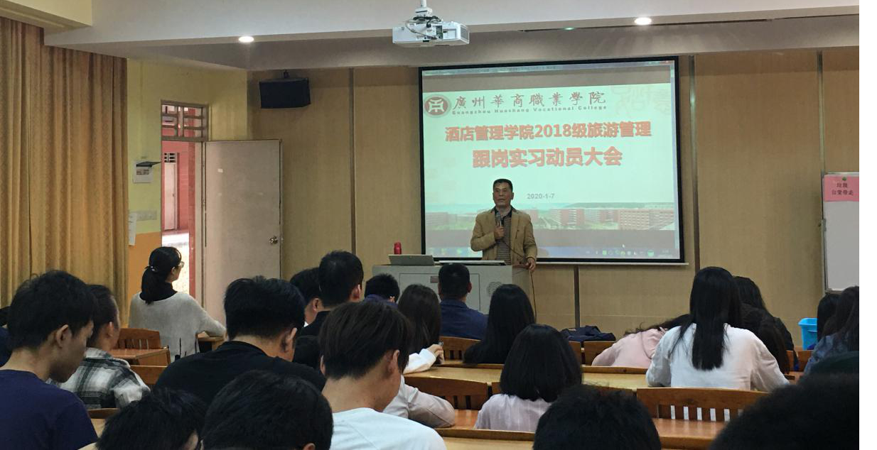 周期老师主持本次大会,为学生介绍了广州太阳城酒店和广州皇朝御苑酒店两家跟岗实习酒店的概况,讲述跟岗实习的必要性与注意事项。旅游专业教师们为学生现场答疑,并回答与实习有关的问题。在此次会上,18级旅游管理1班和2班同学现场确定两家酒店人员分配问题。