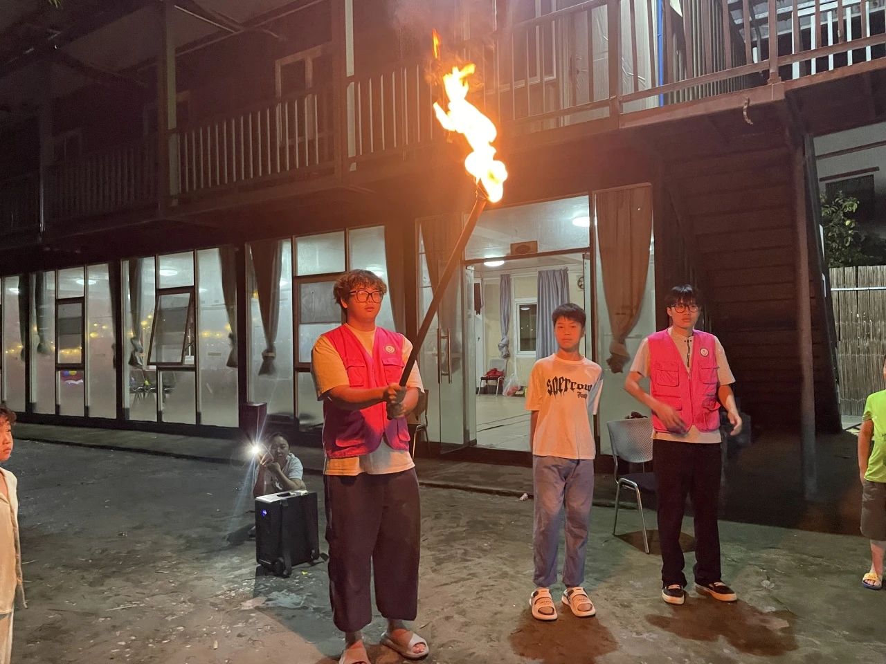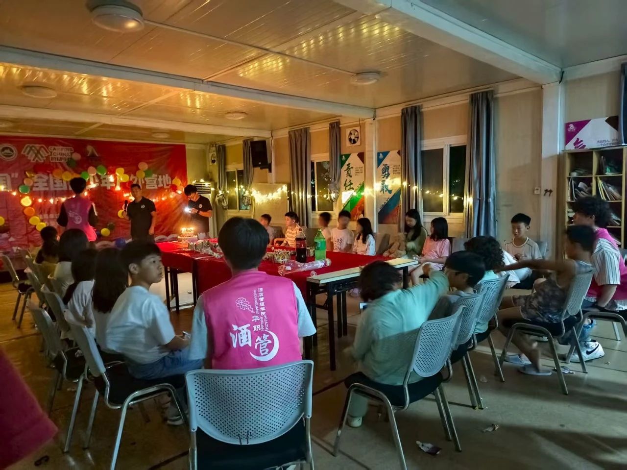 夜幕降临,篝火晚会正式开始。孩子们围坐在篝火旁,载歌载舞,表演了精心准备的节目,展示了才艺与成长。晚会还设置了互动游戏,如“击鼓传花”“你比我猜”等,孩子们在游戏中不断地增进友谊。