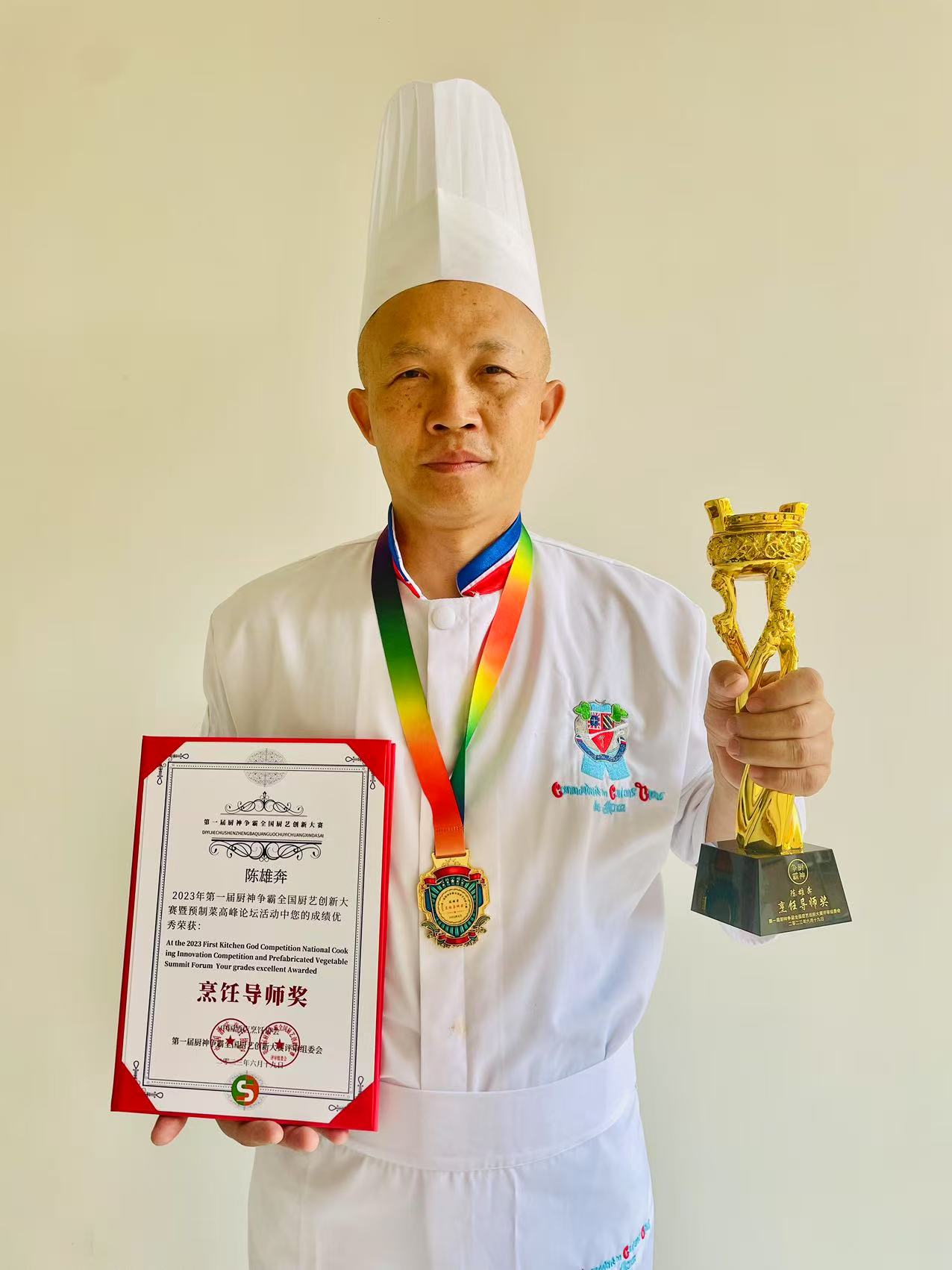 陈雄奔,工程师,国家中式烹调高级技师,获得1+X培训教师证书,中级考评员,法国蓝带美食奖,大中华十大名厨,粤港澳十大厨神等荣誉,获得第二届中囯烹饪大师创意金奖,第四届餐饮食材供应交流会最佳金牌菜式奖,2023年第一届厨神争霸全国厨艺创新大赛暨预制菜高峰论坛荣获烹饪导师奖,2024年第二届中餐超级食神顶级烹饪艺术家技能大赛中荣获中式烹调师个人赛金奖、2024年“羊城工匠杯”获优秀教练员荣誉。30年中餐烹饪制作经验,擅长烹调鲍参翅肚及各类中式菜式制作,曾在江西上饶五星级龙潭湖宾馆任行政总厨,北京昌平会馆任行政总厨,广州喜榕饮食管理有限公司任行政总厨。发表专业论文《探究中式烹饪饮食的高效厨艺技巧》、《科学烹饪在健康饮食中的重要性》、《浅谈中式烹饪的方法及技术创新》、《食物材料烹饪加工中维生素的保护策略》等4篇。