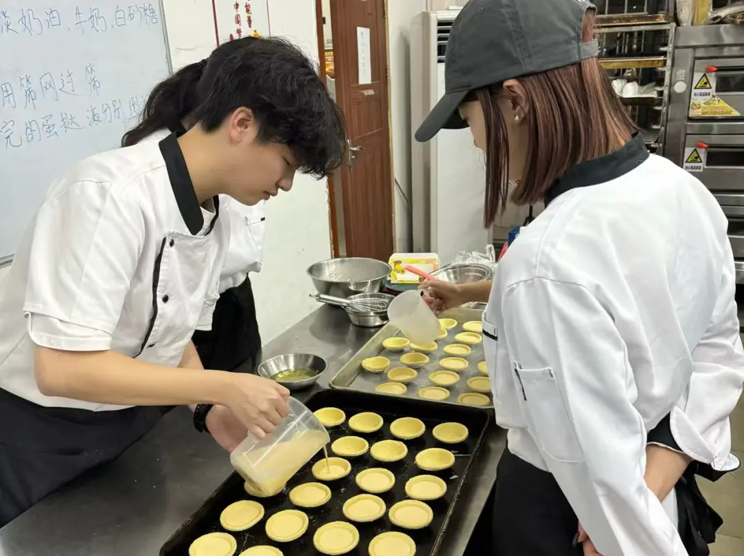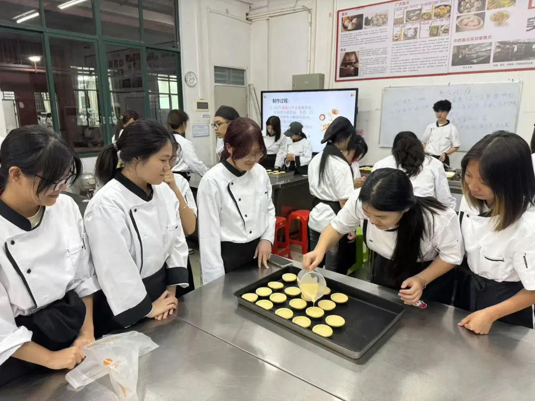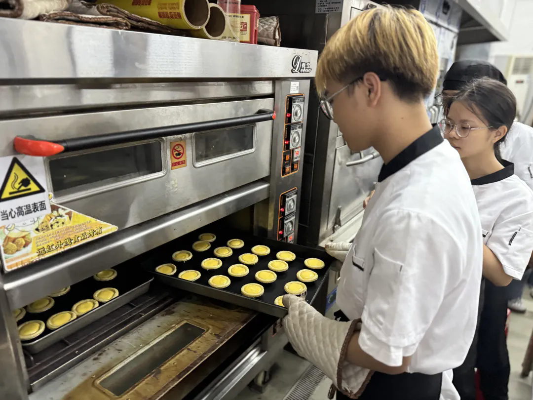 在制作蛋挞的过程中,同学们展现出了极高的热情和专业精神。他们严格按照食谱比例调配蛋挞液,确保每一个蛋挞都能呈现出最佳的风味。在烘烤过程中,同学们轮流守候在烤箱旁,密切关注着蛋挞的颜色变化,以确保蛋挞外皮酥脆、内馅滑嫩。
