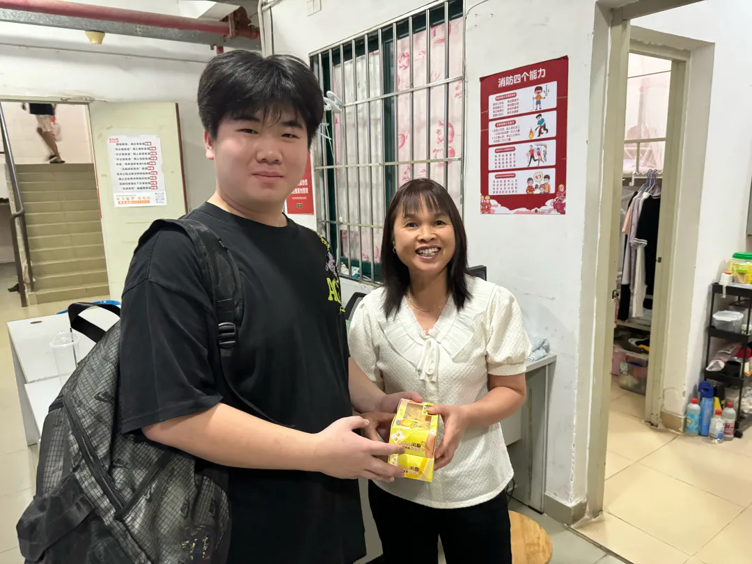 当一炉炉金黄诱人的蛋挞新鲜出炉时,同学们的脸上都洋溢着满足和喜悦。他们将这些蛋挞精心包装,然后分组前往校园的各个角落,亲手将这份心意送到了菜鸟驿站小哥、保安叔叔、饭堂阿姨、外卖小哥和宿管阿姨的手中。