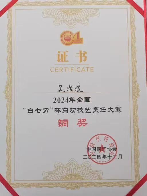 我院教师荣获2024年全国“白七刀”杯白切技艺烹饪大赛铜奖