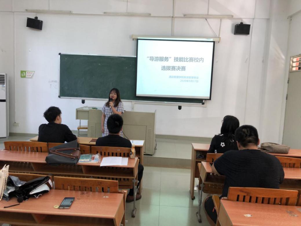 2020年9月15日于旅游实训室进行导游赛项预选赛,为考核选手们的导游词讲解能力和语言能力,预选赛我们设置了自选中文导游词三分钟讲解、英文自我介绍和才艺展示三个环节,共选出两名种子选手进行决赛。