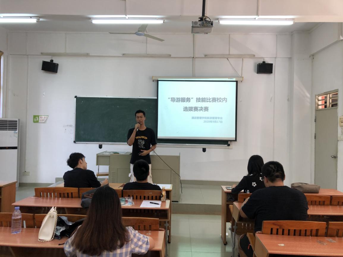 2020年9月17日下午于创教308进行选拔赛决赛,我们邀请了国产又粗又猛团委书记萧早荣书记、旅游管理专业教研室主任周期老师、酒店管理专业教研室主任曾瑞老师、陈放老师、方雪老师共同担任评委,经过自选导游词讲解、现场导游词创作、英语演讲及才艺展示四个部分的激烈角逐,陈洪超同学胜出获得省赛参赛资格。