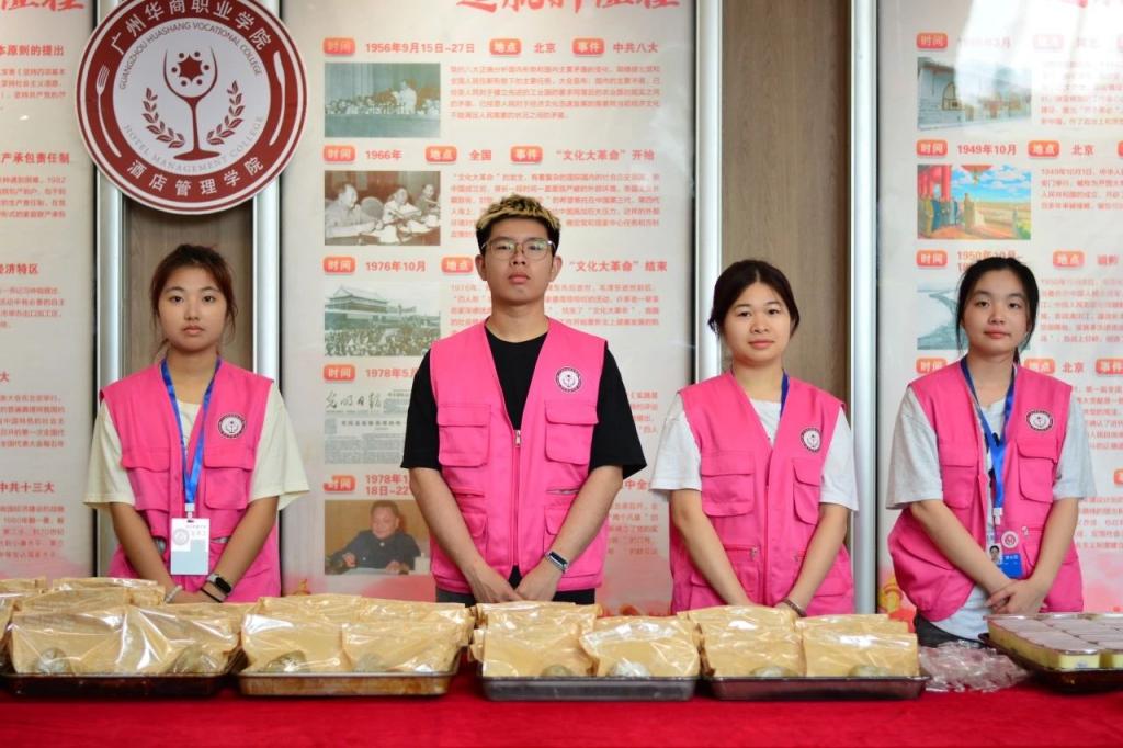 作品展示现场,广州市花都区第二中学的师生们则晓有兴致地驻足观赏。酒管学子们把一份份精美的西式点心以及一杯杯可口怡人的茶饮赠给来宾们免费品尝,赢得了他们声声赞誉。