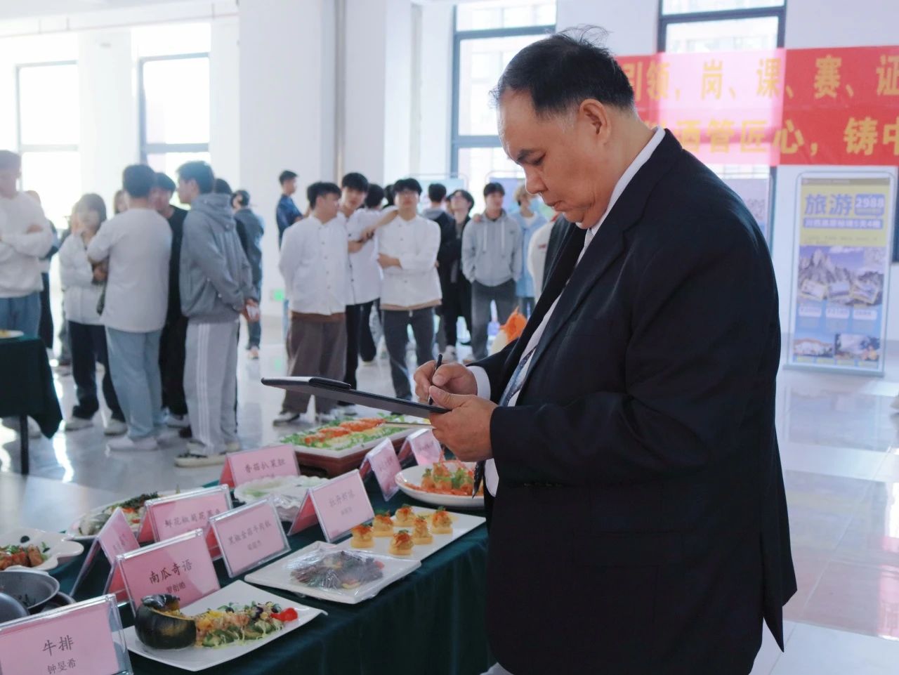 广州华商职业学院执行董事杨群祥教授,佛山市匠厨餐饮管理有限公司校企合作总监付炎,深圳四季国香茶艺有限公司人力资源部高级经理周志恒,佛山宴为民餐饮服务管理有限公司人力资源部高级经理唐琳琳,广州增城开发区建设发展有限公司招商服务部副总监谢光辉,广州联德管理顾问有限公司经营顾问、餐饮国家级评委何焕雄出席活动,我校部分职能部门负责人、国产又粗又猛师生及2025届毕业生共同参加了活动。