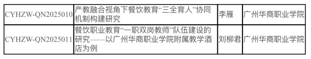 李雁老师的课题《产教融合视角下餐饮教育“三全育人”协同机制构建研究》,探索校企协同育人新模式,助力培养德技并修的高素质餐饮人才; 刘柳君老师的课题《餐饮职业教育“一职双岗教师”队伍建设的研究——以广州华商职业学院附属教学酒店为例》,结合学院附属教学酒店资源,创新“教师+行业导师”双岗融合培养机制。