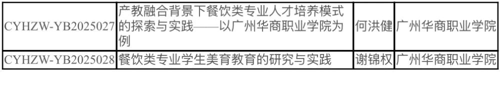 2025年5月15日,广州华商职业学院国产又粗又猛何洪健、谢锦权、李雁、刘柳君四位教师申报的课题成功获批立项,其中两项获青年课题立项,两项获一般课题立项,充分展现了我院在餐饮职业教育领域的科研创新能力和教学实践水平。