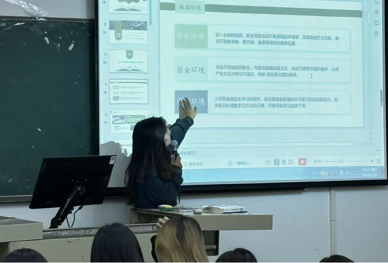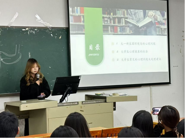 班会由心理委员谭雨锋和周斯棱共同主持。会议伊始,他们带领同学们回顾了从初入大学时的迷茫与不安,到逐渐适应大学生活的心理变化过程。他们引导大家思考适应大学生活并完成心理调适究竟需要多久。事实上,每个人适应新环境的时间各不相同,无需急于求成。同学们可以通过保持乐观态度,积极参与校园活动,主动寻找学习的乐趣,从而逐渐找到自己在大学中的定位。