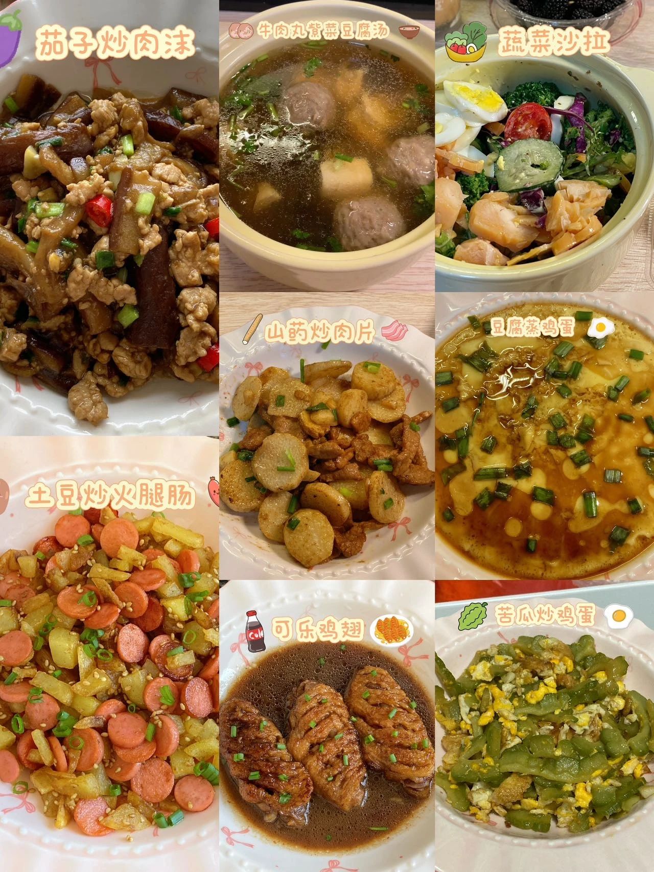 ①茄子炒肉沫(清热解毒,润肠通便,利水消肿)②土豆炒火腿肠(健脾益气,补血强肾)③牛肉丸紫菜豆腐汤(强壮骨骼,增强免疫)④山药炒肉片(补益脾肺)⑤可乐鸡翅(特别好吃,吃完很开心)⑥蔬菜沙拉(补充维生素)⑦苦瓜炒鸡蛋(清热解毒)