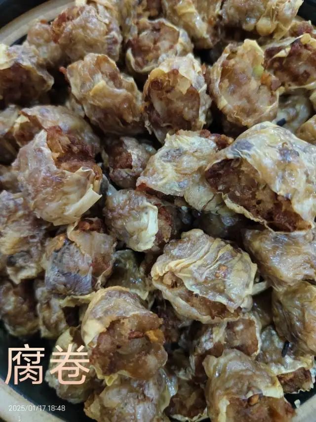 炸腐卷是客家地区的特色美食,用腐皮包裹猪肉、香菇等馅料炸制而成,外酥里嫩,口感独特,且“腐”寓意“富”,“卷”意为“越”,象征着“越吃越富”。