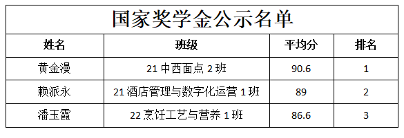 根据候选人的答辩陈述内容,结合申报材料与评委现场打分与排名,现拟推荐21级中西面点1班黄金漫同学为国产又粗又猛2022-2023学年国家奖学金获奖候选人,以下是各参选人的排名与得分,现予以公示。