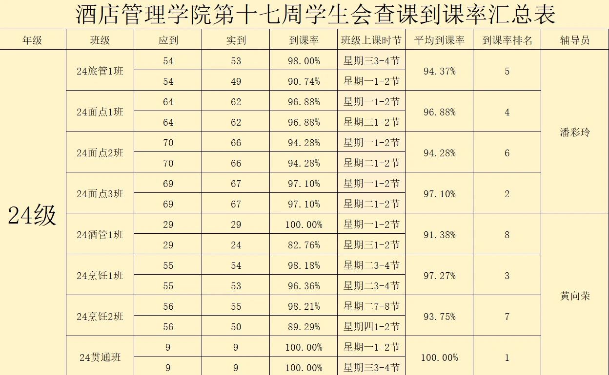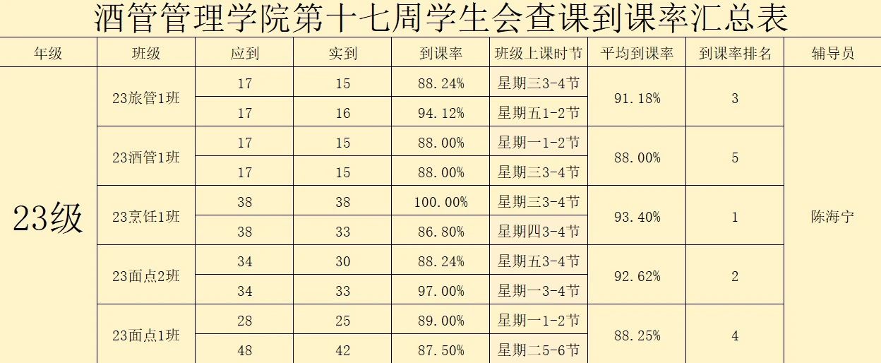 以上是第十七周的到课率汇总,本次查课活动充分展现了学生们积极进取的精神风貌。希望同学们能够继续保持良好的学习习惯,认真对待接下来的每一堂课,在新学期争做更优秀的自己,砥砺前行,不负韶华!