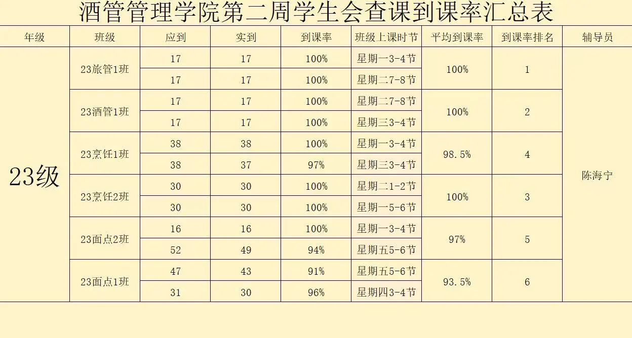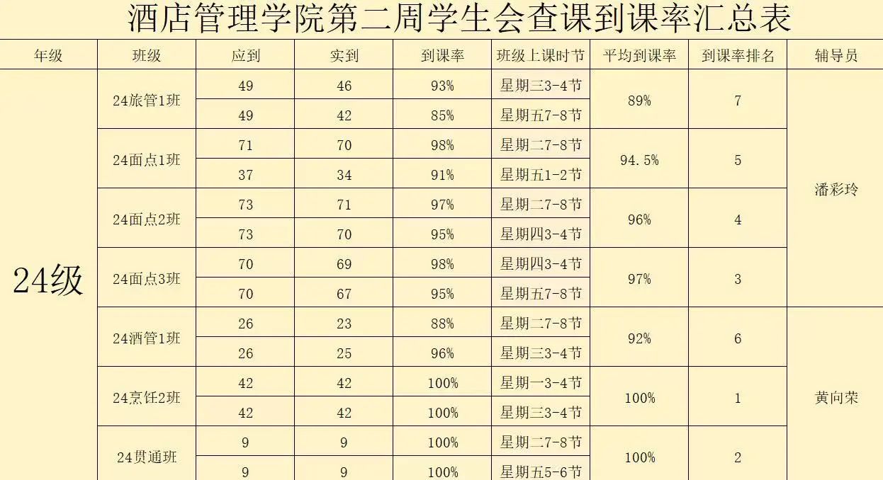 以上是第二周的到课率汇总,本次查课活动充分展现了学生们积极进取的精神风貌。希望同学们能够继续保持良好的学习习惯,认真对待接下来的每一堂课,在新学期争做更优秀的自己,砥砺前行,不负韶华!