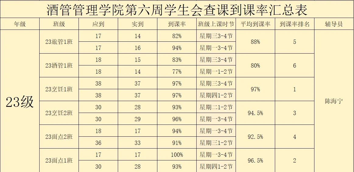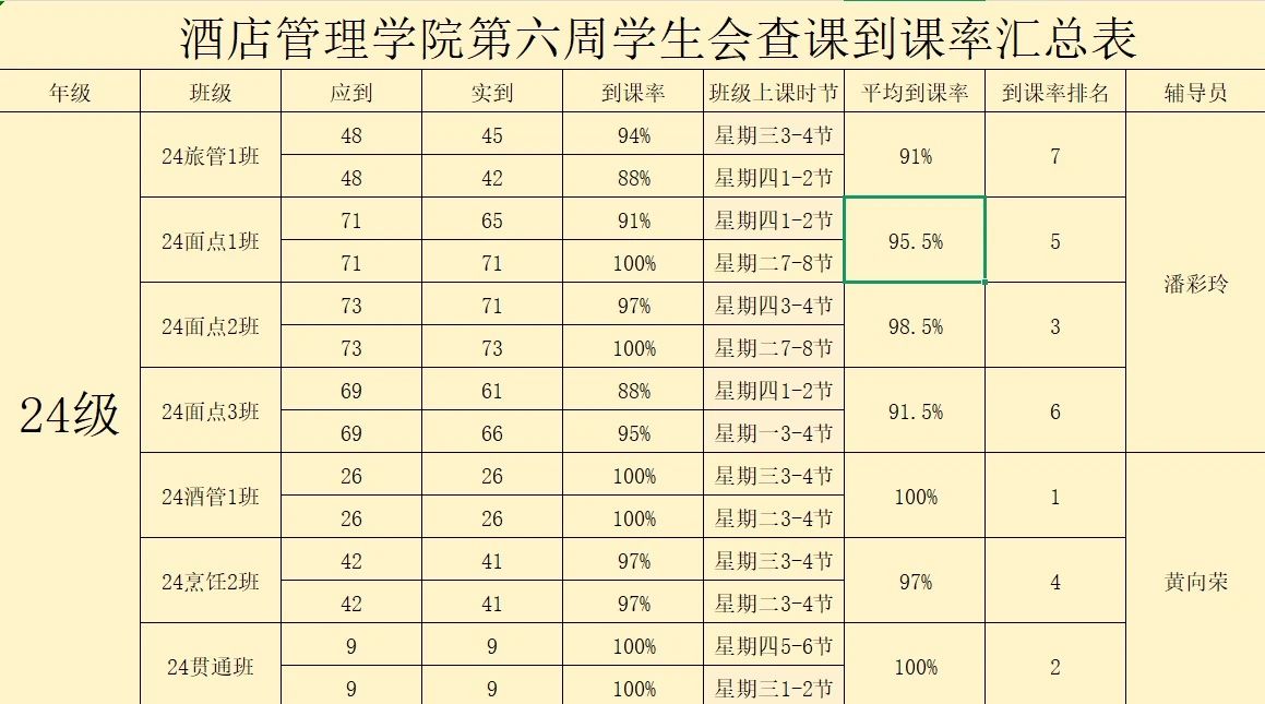 以上是第六周的到课率汇总,本次查课活动充分展现了学生们积极进取的精神风貌。希望同学们能够继续保持良好的学习习惯,认真对待接下来的每一堂课,在新学期争做更优秀的自己,砥砺前行,不负韶华!