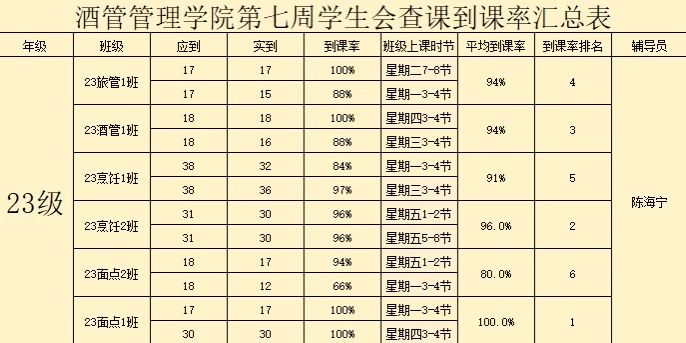 以上是第七周的到课率汇总,本次查课活动充分展现了学生们积极进取的精神风貌。希望同学们能够继续保持良好的学习习惯,认真对待接下来的每一堂课,在新学期争做更优秀的自己,砥砺前行,不负韶华!