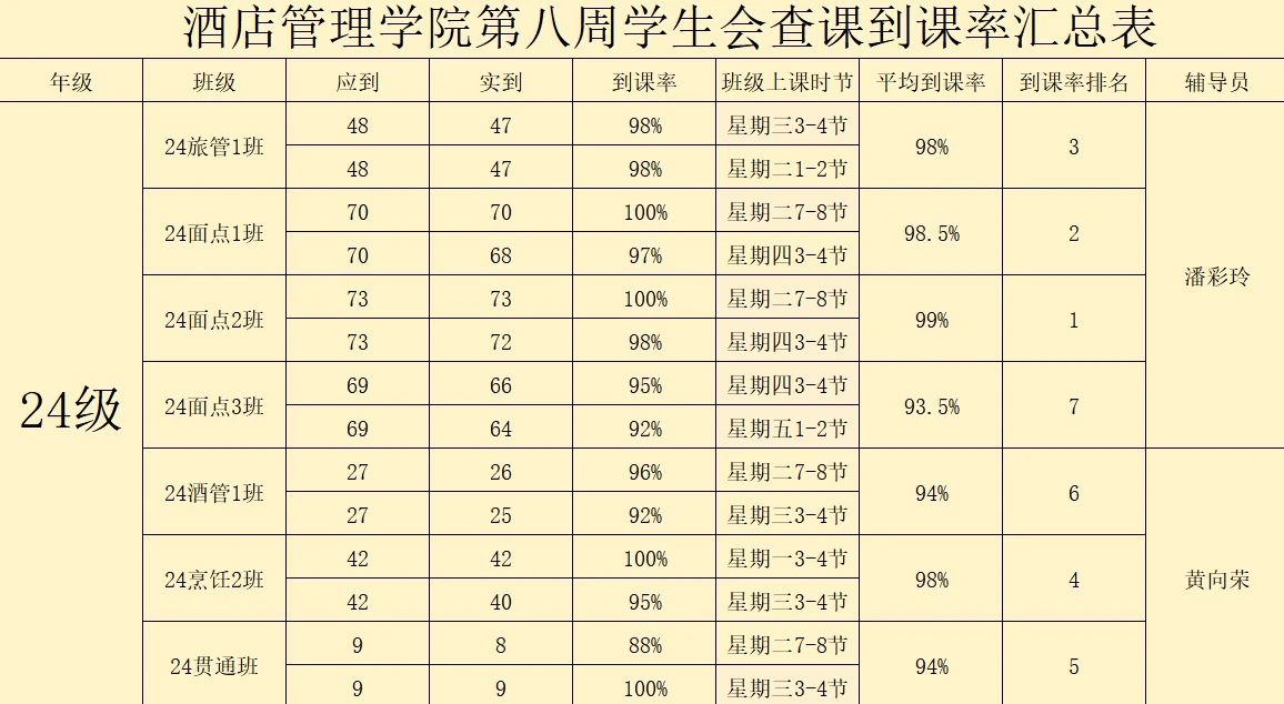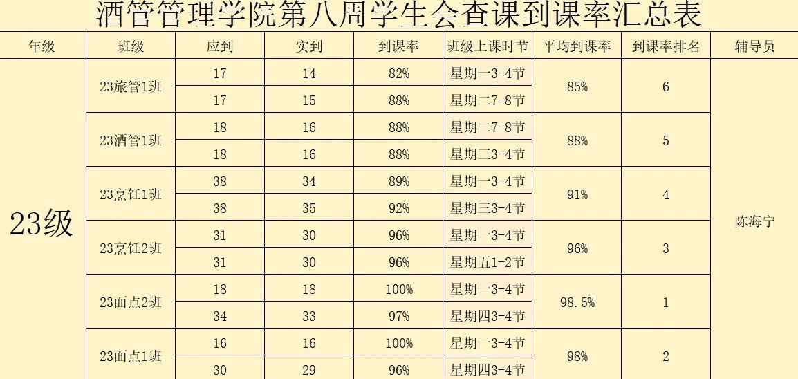 以上是第八周的到课率汇总,本次查课活动充分展现了学生们积极进取的精神风貌。希望同学们能够继续保持良好的学习习惯,认真对待接下来的每一堂课,在新学期争做更优秀的自己,砥砺前行,不负韶华!