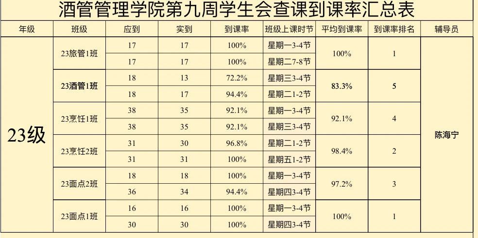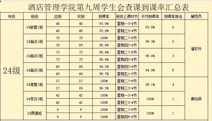 以上是第九周的到课率汇总,本次查课活动充分展现了学生们积极进取的精神风貌。希望同学们能够继续保持良好的学习习惯,认真对待接下来的每一堂课,在新学期争做更优秀的自己,砥砺前行,不负韶华!