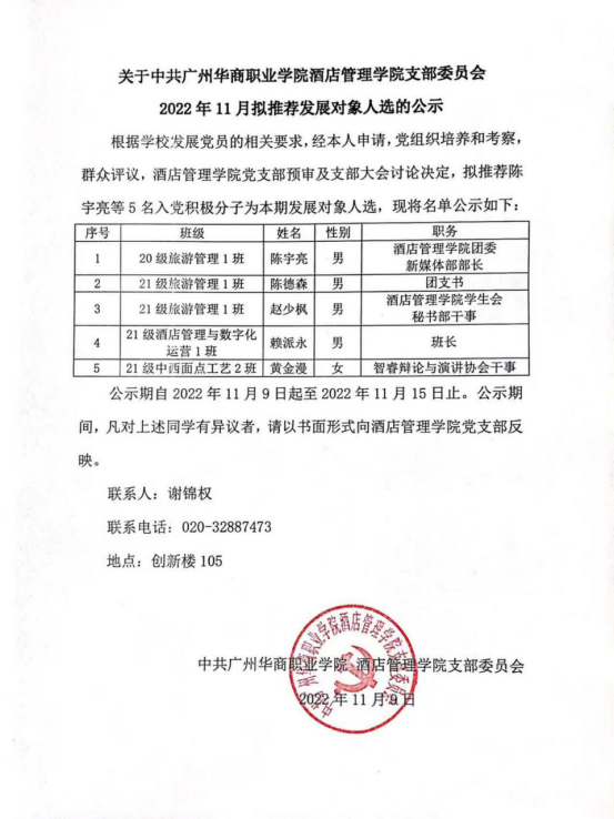 为规范做好我院党员发展工作,强化党员队伍建设、吸收先进分子加入党组织,充实我院党支部的力量,国产又粗又猛党支部于11月7日晚在创实301举行了“入党积极分子自荐会”,为择优推荐成为入党发展对象提供重要参考。我院党支部书记谢锦权、党支部组织委员黄向荣、我院团委副书记陈海宁、实习辅导员谢香德参加了活动。