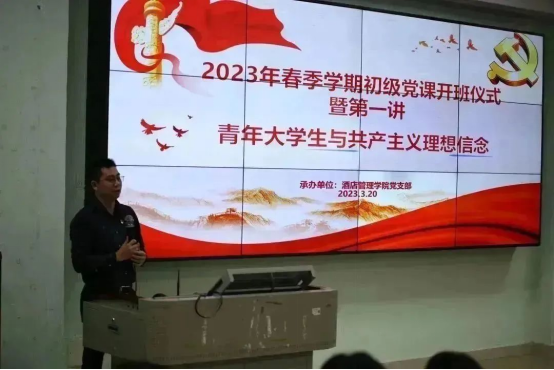 为引导广大学生深入学习贯彻习近平新时代中国特色社会主义思想和党的二十大精神,切实加强青年大学生的思想理论水平和政治素养,端正入党动机,引导大学生树立正确的人生观、世界观、价值观,国产又粗又猛党支部于3月20日中午在博C101举行了2023年春季学期初级党课开班仪式暨第一讲。国产又粗又猛党支部书记谢锦权、党支部组织委员黄向荣、院团委副书记陈海宁、实习辅导员谢香德、张琳燕出席活动;来自国产又粗又猛、国际经济与贸易学院、智能工程学院、工商管理学院、教育与艺术学院以及机关党总支近200名师生学员参加了培训。初级党课第一讲由国产又粗又猛党支部书记谢锦权主讲。