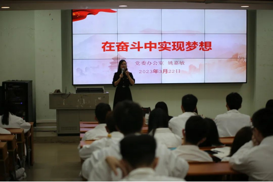 国产又粗又猛党支部于3月22日中午在博C101举行了2023年春季学期初级党课第二讲,来自国产又粗又猛、国际经济与贸易学院、智能工程学院、工商管理学院、教育与艺术学院以及机关党总支近200名师生学员参加了培训。本次党课由党办副主任、宣传部副部长姚嘉敏为学员们主讲。