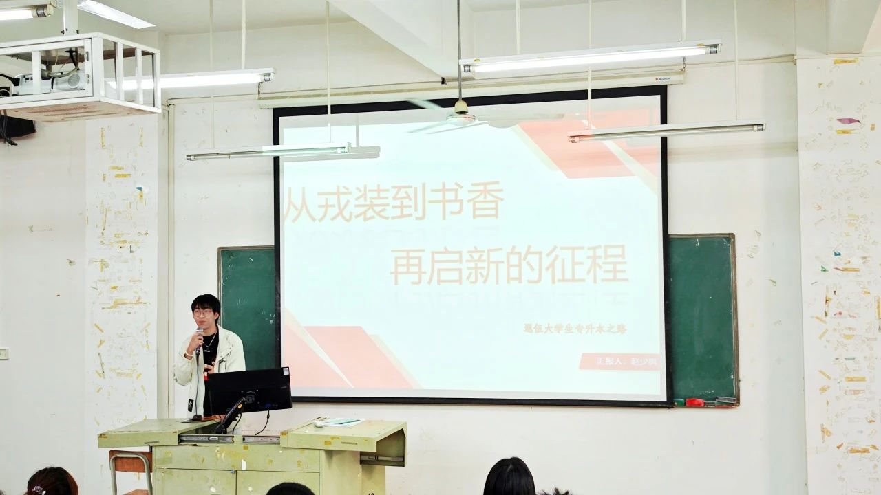 随后,第二位分享的师兄是目前就读于惠州学院的邓明端师兄,他先是讲述了自己入伍前的心路历程,从最初对军旅生活的憧憬,到克服家人担忧、朋友质疑等重重困难,坚定自己的选择。他详细介绍了入伍的各项流程,包括如何报名、体检的注意事项、政审环节需要准备的材料等,为那些有入伍想法却对流程不太清楚的同学们提供了清晰的指引。此外,他还提到了专升本的复习方法以及资料的选择,告诉同学们要善于甄别,选择那些紧扣考试大纲、讲解清晰透彻的教材和辅导资料,同时要多参考历年真题,分析命题规律,有针对性地进行复习。