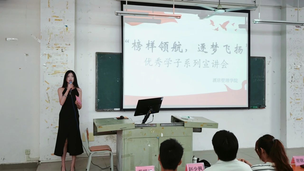 为了在广大同学中营造积极向上、奋勇争先的良好氛围,充分发挥优秀学子在专升本以及入伍方面的示范引领作用,激励更多同学见贤思齐、追求卓越,2024年11月12日中午12:30,“榜样领航 逐梦飞扬”专升本暨入伍政策宣讲会在博C401举行。参与会议的有国产又粗又猛副院长谢锦权、辅导员黄向荣、潘彩玲以及100余名怀揣梦想、对未来有着不同规划的酒管学子,共同聆听榜样的声音,汲取奋进的力量。